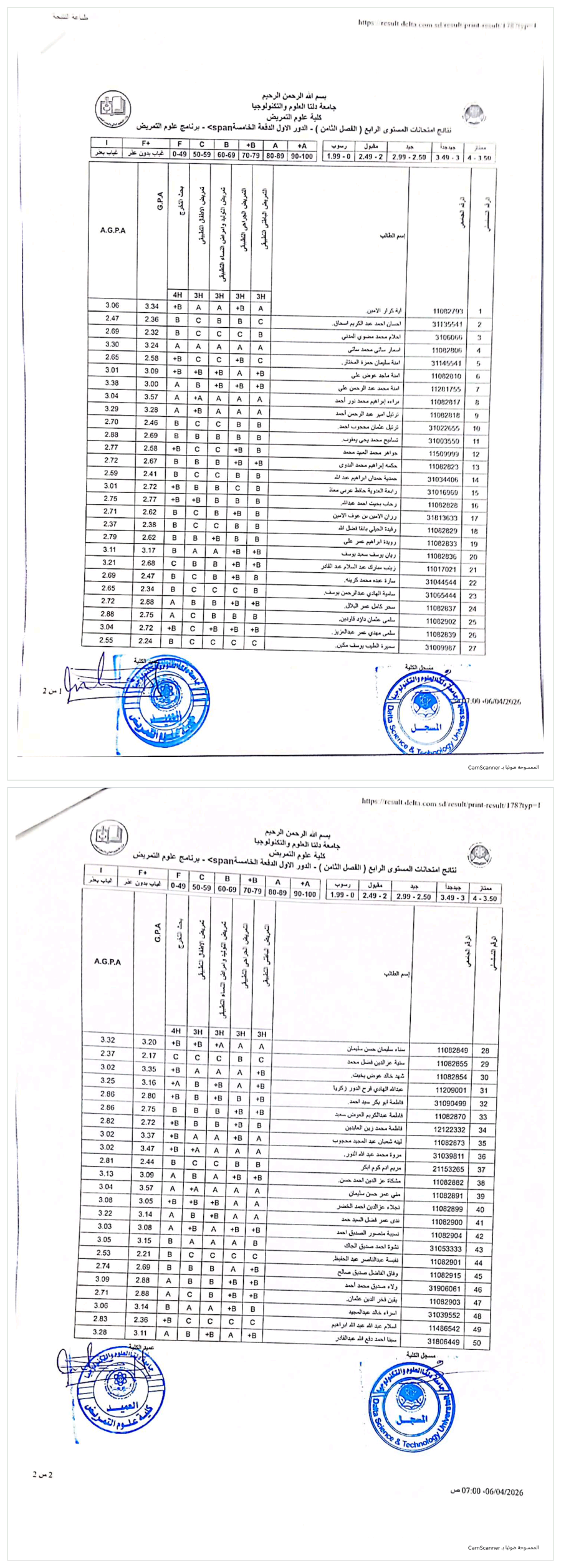 نتيجة الفصل الدراسي الثامن لخريجي الدفعة الخامسة بكلية علوم التمريض